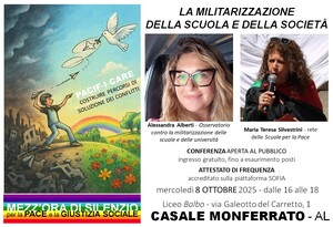 CASALE MONFERRATO, AL - Mercoledì 8 OTTOBRE 2025 alle 16 nell’Aula Magna del Liceo Balbo si svolgerà la conferenza sul tema LA MILITARIZZAZIONE DELLA SCUOLA E DELLA SOCIETÀ, prima del ciclo di 6 incontri pubblici tenuti a cadenza quindicinale fino a dicembre 2025 e svolto nell’ambito del programma intitolato PACIF-I-CARE: COSTRUIRE PERCORSI DI SOLUZIONE DEI CONFLITTI organizzato dai coordinatori della settimanale MEZZORA DI SILENZIO PER LA PACE E LA GIUSTIZIA SOCIALE.