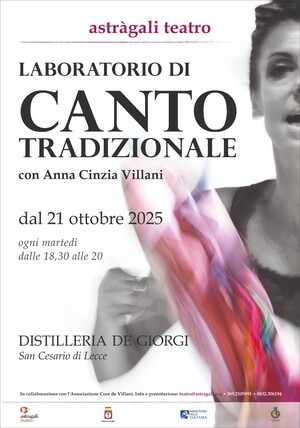 Prende il via martedì 21 ottobre, alle ore 18.30, presso la Distilleria di San Cesario di Lecce, il laboratorio di canto tradizionale salentino, tenuto dalla cantante e ricercatrice Anna Cinzia Villani e organizzato con Astràgali Teatro.