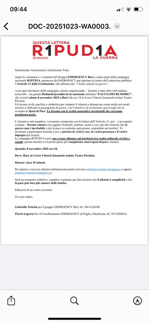 Il Gruppo EMERGENCY di Bari organizza, insiele a tante altre città italiane (circa 60), un grande flashmob/presidio/sit-in nazionale intitolato "FACCIAMO RUMORE".