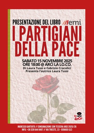Nel pomeriggio di Sabato 15 Novembre 2025 alle ore 18:00 si svolgerà presso il Circolo Arci La Lo.Co. di Osnago, via Trieste n 23, in provincia di Lecco, la presentazione del libro I Partigiani della Pace (Tussi L., Cracolici F. - Edizione EMI), a cura dell’autrice Laura Tussi, docente, giornalista e scrittrice.