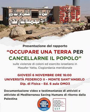 Giovedì 6 novembre alle ore 16:00 presenteremo il nostro rapporto semestrale "Occupare una terra per cancellarne il popolo" presso l'Università Federico II sede di Monte Sant'Angelo (Dip. di Fisica - ed. 6 aula OMO3).