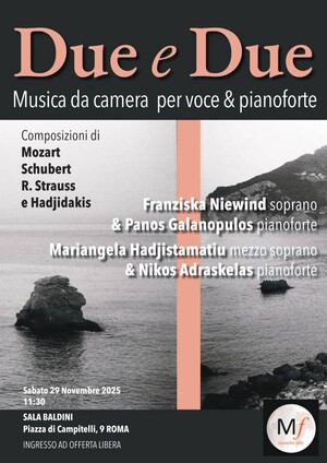Nella seconda parte, la mezzosoprano Mariangela Hadjistamatiu e il pianista Nikos Adraskelas presenteranno il ciclo di canzoni “Ciclo del C.N.S.” di compositore greco Manos Hadjidakis, seguito da una selezione di brani tratti dal ciclo “Magnus Eroticus.” In queste opere, la poesia e la musica si fondono in un linguaggio intimo e appassionato, rivelando le molte sfumature dell’animo umano e l’inconfondibile sensibilità del grande compositore greco.