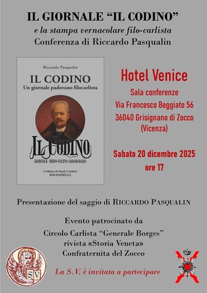 Durante la conferenza sarà presentato il libro di Riccardo Pasqualin "Il Codino. Un giornale padovano filocarlista" (edito da Solfanelli).