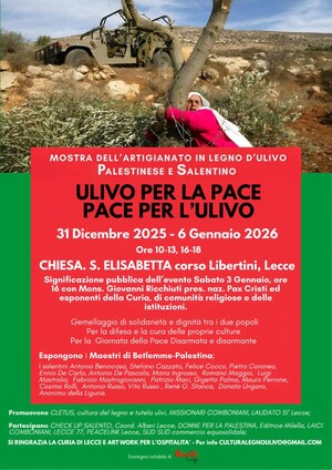 Ulivo per la Pace Pace per l'Ulivo. Mostra dell'artigianato in legno d'Ulivo Palestinese e Salentino dal 31 dicembre al 6 gennaio a Lecce. il 3 gennaio incontro con Mons. Ricchiuti Presidente Nazionale di Pax Christi