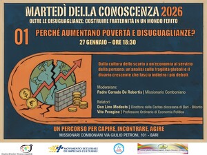 via Giulio Petroni 101 - Bari (BA)I Martedì della Conoscenza 2026 "Oltre le diseguaglianze: costruire fraternità in un mondo ferito" I Missionari Comboniani, il MEIC - ... - gen29giomostra fotografica