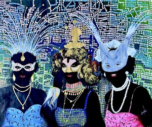 La messa in scena è apertamente enfatica, quasi ostentata. Non teme l’eccesso, non cerca il sussurro. È un impianto visivo che si impone, che invade lo spazio dello sguardo con colori saturi, contrasti vibranti, densità compositiva. C’è una componente volutamente chiassosa, una teatralità dichiarata che non chiede permesso ma cattura immediatamente l’attenzione. E tuttavia, proprio in questa sovrabbondanza controllata, si attiva un secondo livello di lettura. L’occhio, inizialmente attratto dall’impatto globale, è poi costretto a rallentare, a distinguere, a entrare nei dettagli. La ricchezza visiva non produce caos, ma stratificazione. Ogni postura, ogni variazione cromatica, ogni modulazione della superficie partecipa a una regia rigorosa che trasforma l’apparente eccesso in costruzione.