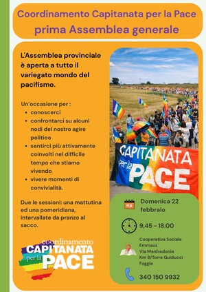 L’invito è rivolto a tutte le pacifiste e i pacifisti della provincia. La partecipazione è aperta a chiunque voglia contribuire, nel rispetto dell’autonomia e della laicità che contraddistinguono il Coordinamento Capitanata per la Pace. Non sarà solo un evento, ma ci si augura l’inizio di un nuovo e più efficace cammino.