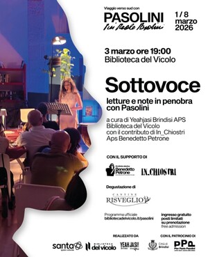 Ex Convento Santa Chiara - Brindisi (BR)Sottovoce con Pasolini | Letture e note in penombra Brindisi: mercoledì 3 marzo 2026 - ore 19:00 Biblioteca del Vicolo - Ex Convento di Santa ... - mar4merevento