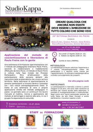 Una settimana di formazione non formale con il metodo del pedagogista brasiliano Paulo Freire, secondo la rielaborazione e l'adattamento eseguiti da Gino Piccio. Il metodo di Paulo Freire si colloca nella fase iniziale dei Processi Partecipativi.
