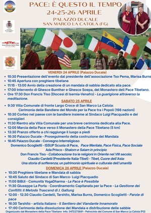 Tre giornate di incontri, spiritualità e dialogo interreligioso a San Marco La Catola, dove dal 24 al 26 aprile si terrà l’iniziativa “Pace, è questo il tempo”, promossa dal Monastero della Pace Tibetano – associazione Tso Pema con il patrocinio del Comune.