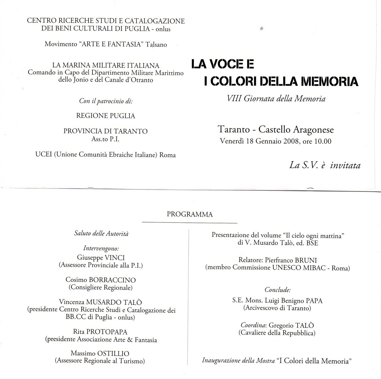 Il programma avrà inizio a Bari martedì 15 gennaio 2007, alle 16.00, con una dissertazione a più voci nel Salone degli Affreschi dell’Università di Bari. L’Assessore Silvia Godelli introdurrà una lectio magistralis sui temi della Shoah di Moni Ovadia, «l’ebreo narrante» del teatro italiano, e dello storico Luciano Canfora. Il Magnifico Rettore, Corrado Petrocelli, porterà il suo saluto. Alle 21.00 Moni Ovadia sarà al Teatro Kursaal con lo spettacolo «Cabaret Yiddish» (Info 080 5212484).